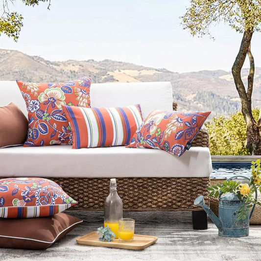 Coastal Bloom Outdoor Cushion Cover Set – Terracotta Citrus Floral & Stripe (2 Pack) 45x45